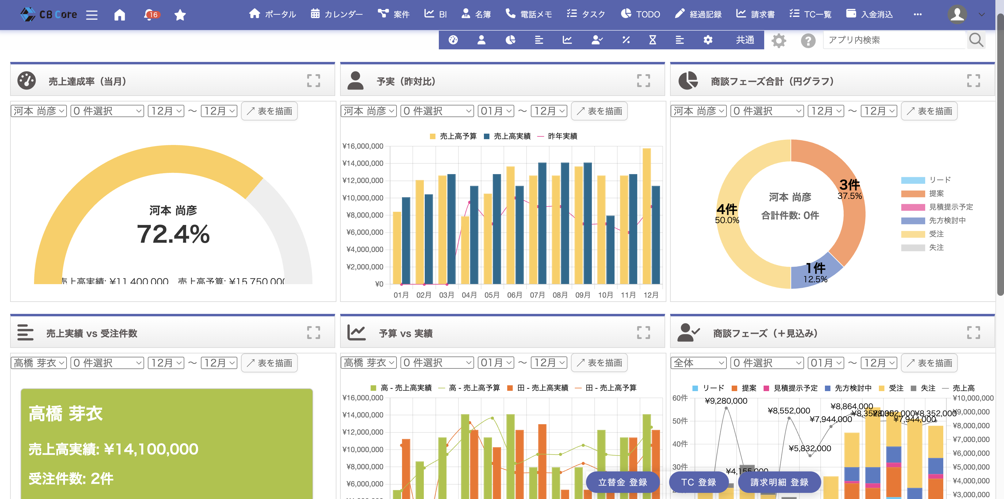 会社の様々なデータを視覚的に分析し、経営状況を多角的に把握できるダッシュボード機能。