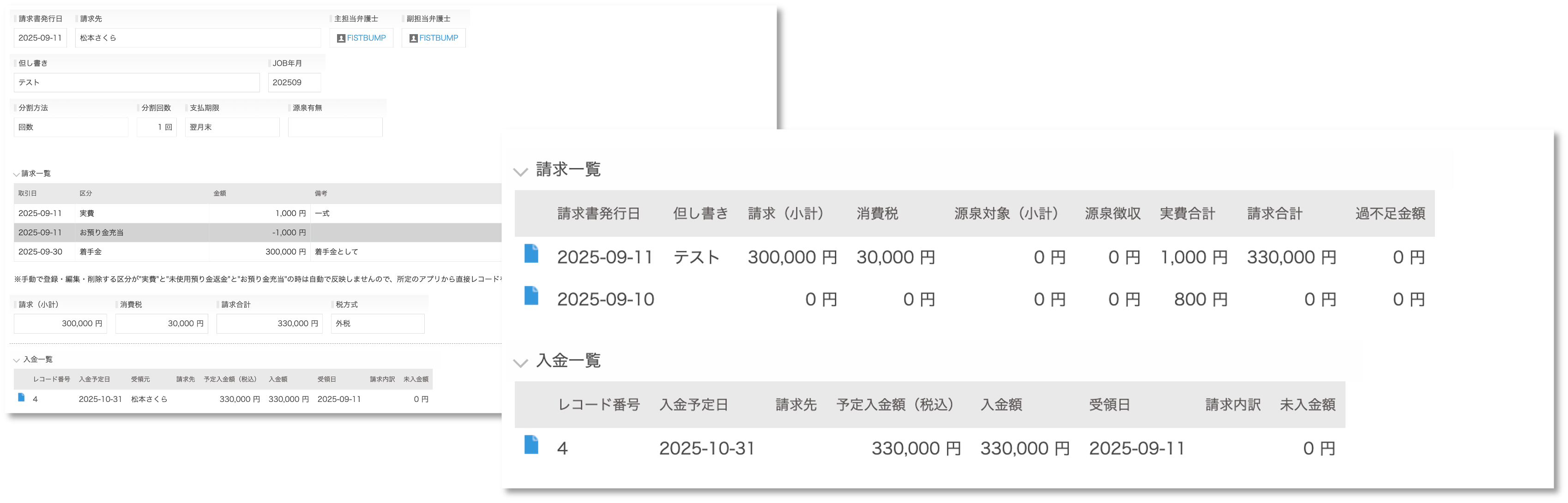 顧問料やスポット業務の請求データを管理。請求書発行や入金状況の確認を効率化します。